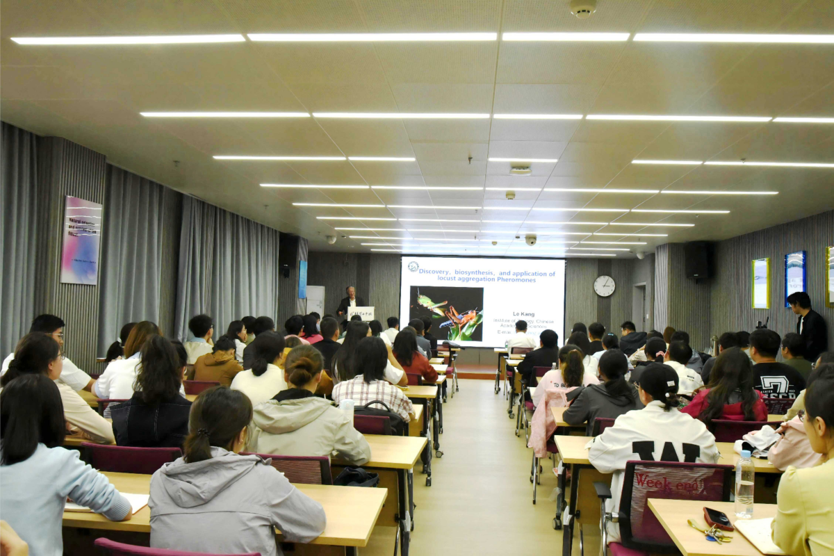 报告中,康乐院士系统阐述了蝗虫群聚信息素的发现历程与研究细节,从基础理论到实际应用层层展开,生动讲解了信息素4-乙烯基苯甲醚(4VA)在蝗虫体内的产生过程,揭示了蝗虫如何利用植物源常见氨基酸合成其特有的群聚信息素。基于对4VA生物合成途径的深入解析,康乐院士团队开发出一种小分子抑制剂,可精准调控4VA的合成与释放,从而有效干预蝗虫群聚行为。该研究不仅为蝗灾的“绿色防控”提供了全新策略,也为利用昆虫信息素精准调控害虫行为开拓了新思路,有力推动了害虫防控技术向绿色、可持续方向迈进。